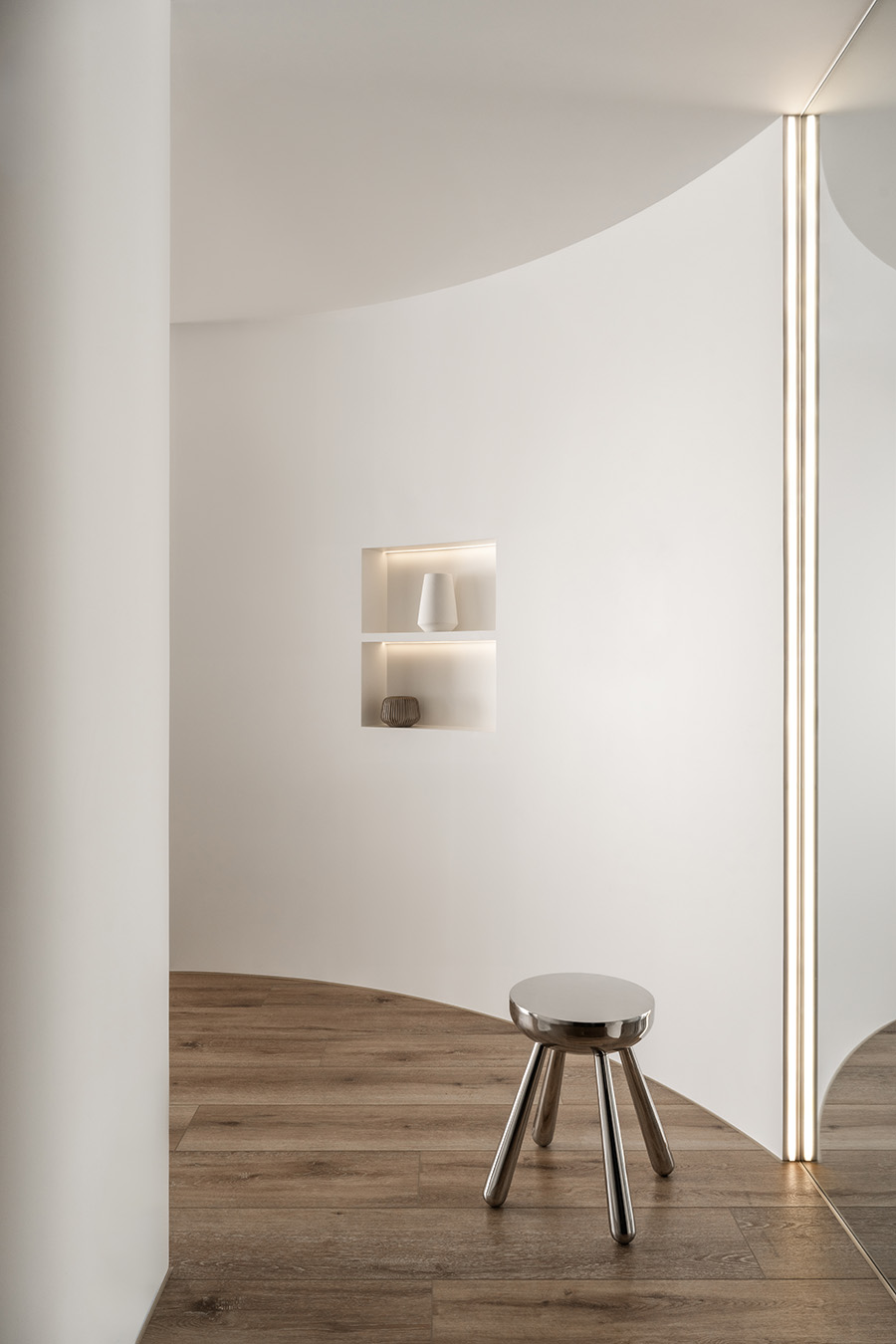 除了援引一笔柔弧,消解入口畸零地之外,再铺叙一面落地明镜,侧边则缀饰一条垂直灯带,瞬时便拉展了落尘区的狭窄幅度,特意以斜面收折,视线就会慢慢消融在边界,悄悄打开了短廊道的朗阔感。