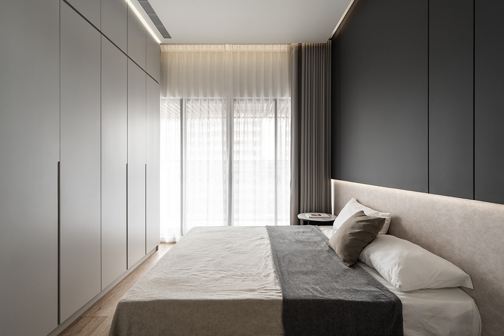 主卧亦是屋主每回到饭店度假时,特别喜爱之域,延续公区一致底蕴,上半部带入沉稳深色板材为床背板、下方则贴覆墙布为面。