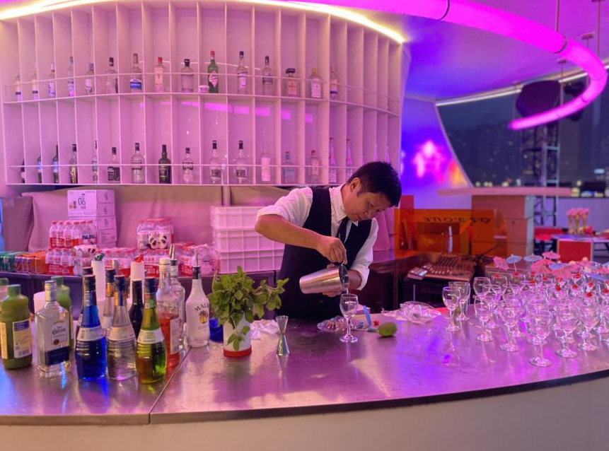 让人惊喜的是细节里的讲究,即使是在船上,章叔叔团队依然能让客户享受到和酒店一样的规格,红色桌布熨得笔挺,骨碟碗筷摆得整整齐齐,酒店式的桌椅配套。宴席结束的茶歇时间,调酒师现场调制鸡尾酒,橙皮在杯口划出弧线,气泡水滋滋作响,这排场完全不输星级酒店。
