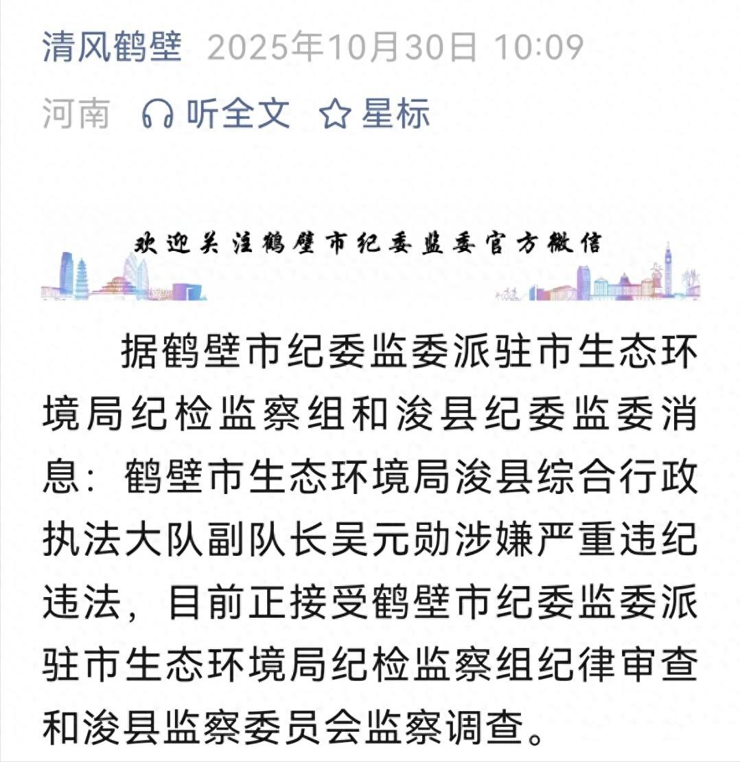 据鹤壁市纪委监委派驻市生态环境局纪检监察组和浚县纪委监委消息:鹤壁市生态环境局浚县综合行政执法大队副队长吴元勋涉嫌严重违