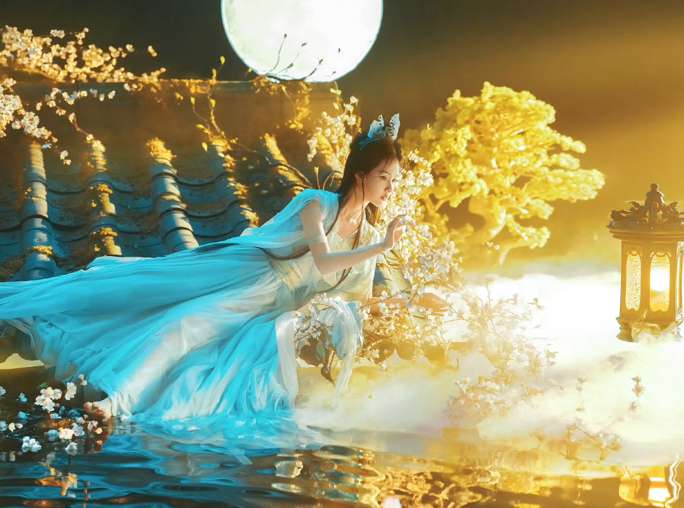 清蓝仙裙映月光,低眉合掌显悲悯。陈都灵凭借一组“玉面观音”写真,再次定义了古典美学的现代表达。