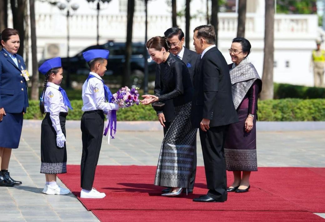 当天的泰王选择一身深蓝色高定西服,胳膊上戴着的黑色孝袖十分抢镜,不知道的原因的还以为她出席的是葬礼,殊不知国王陛下这是参加老挝欢迎宴会。