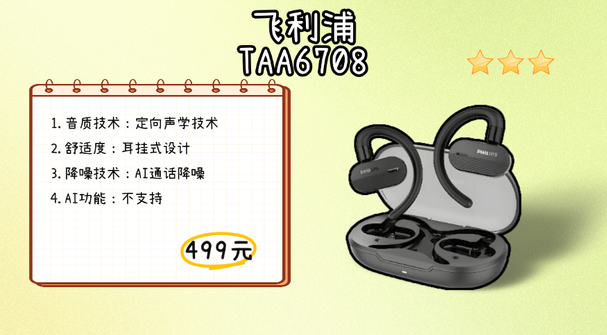 飞利浦TAA6708采用分体式耳挂设计,配备独特的双轴铰链结构,支持多角度调节以适应不同耳型。搭载14.2mm驱动单元并采用定向声学技术,声音传播指向性明确。人声表现清晰自然,高频细节保留完整,中频密度适中。不过在低频量感和动态表现方面中规中矩,对于重低音音乐类型表现力相对有限,更适合人声、轻音乐等日常聆听场景。
