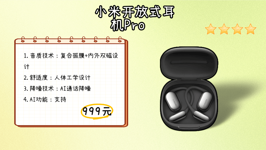 小米开放式耳机Pro采用人体工学设计,通过计算的耳挂曲线实现舒适稳固的佩戴体验。开放式结构确保用户在享受音乐时能持续感知周围环境,提升户外使用安全性。搭载18×13mm超动态双磁动圈单元,采用复合振膜与内外双磁设计,带来更强劲的驱动力。人声表现饱满细腻,中频密度出色,高频延展明亮通透。其声学结构在控制漏音方面效果良好,低频量感与下潜深度在开放式耳机中表现突出,适合对音质有较高要求的用户。