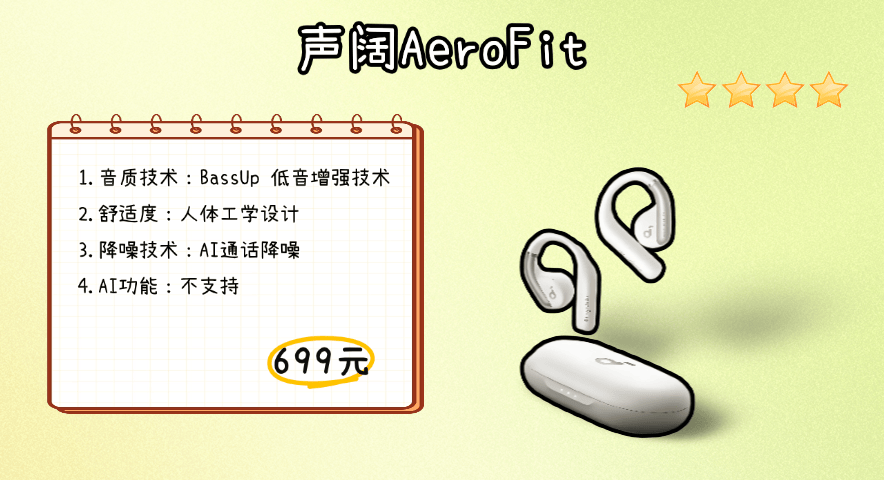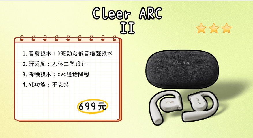 音质方面,强调无损音质和3D环绕。搭载DBE动态低音增强技术,在开放式结构中实现优于同级的低频表现。支持aptX Lossless无损传输,为安卓用户提供高清音频基础。续航表现相较竞品不占优势,缺少自适应降噪等AI功能,智能化体验稍显不足。凭借声学基础与差异化的低音增强技术,在699元价位建立了独特的竞争优势。