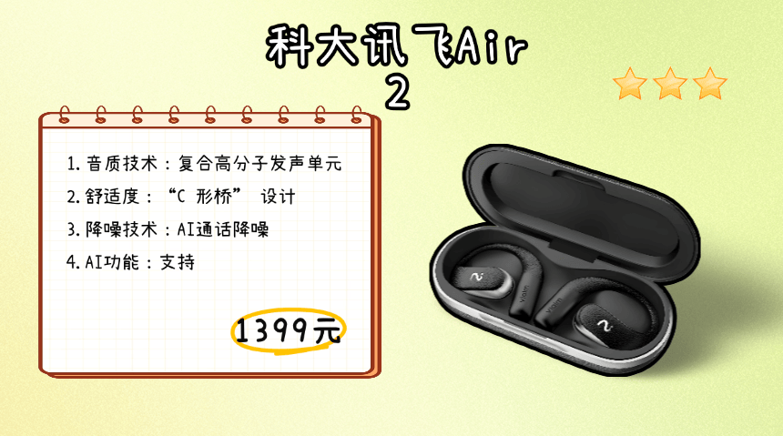 基于以上特点,科大讯飞Air 2非常适合以下人群:商务人士与频繁通话者:AI通话降噪和防漏音技术能确保在会议、通勤等场景下通话清晰且私密,2项AI功能也可能在语音助手、翻译等方面提供便利。重度用户与长途旅行者:超长的综合续航能力,非常适合需要长时间佩戴、不便频繁充电的用户。关注隐私的用户:对通话和听音隐私有较高要求的用户,其反向声波抵消技术是一个关键吸引力。追求科技感的智能设备爱好者:对AI功能有好奇和需求的用户,希望耳机能提供超越基础听音和通话的智能体验。
