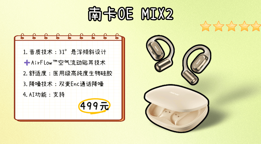 同时,它还融合Ai功能,集成讯飞、DeepSeek等多模态南卡AI智能系统,满足翻译、交互、创作等多场景需求,让耳机从“好声音”进化为全能伙伴。凭借智能+音质的双重优势,OE Pro2已获得500+数码博主与60+媒体一致认可,成为开放式耳机行业独一档的音质与功能标杆。