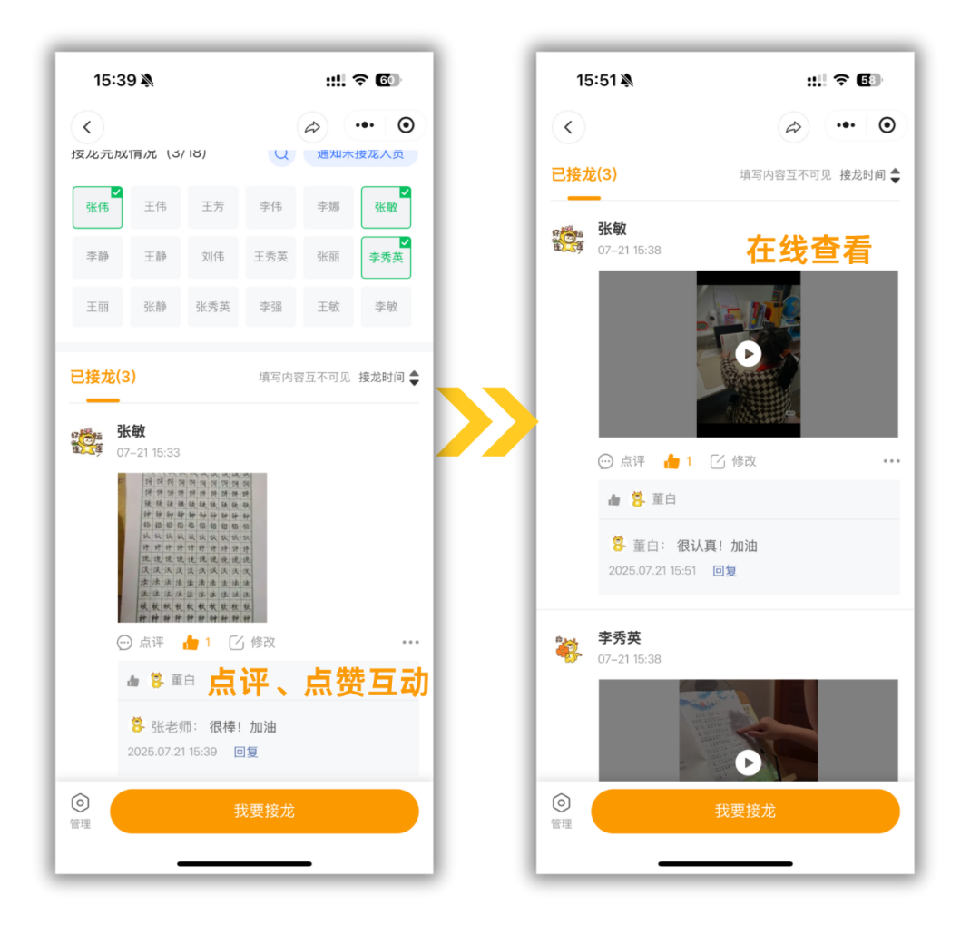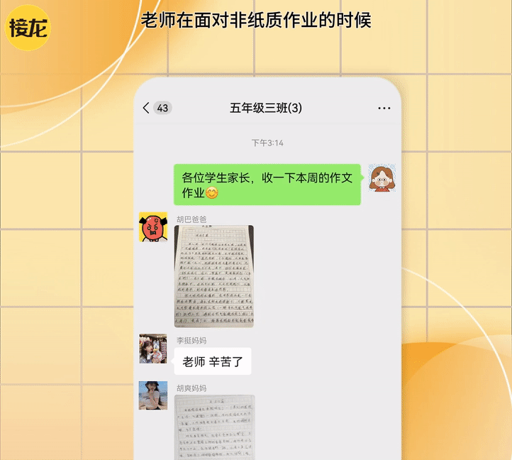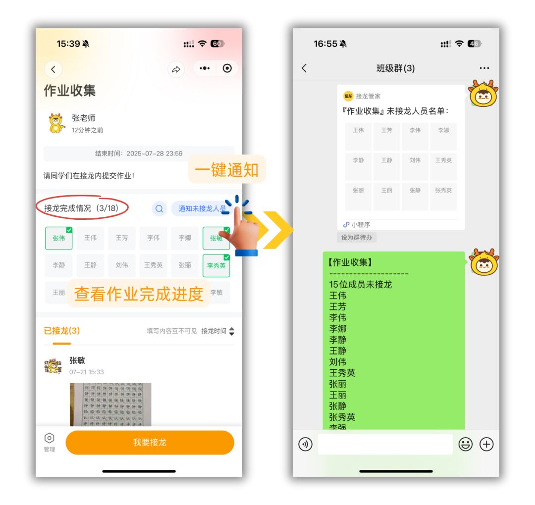 使用接龙管家,导入班级学生名单,学生提交作业后,名字自动亮起,作业进度一目了然,无需手动统计。