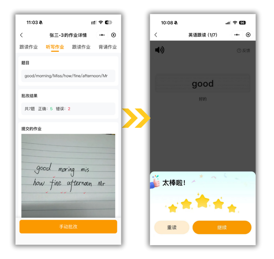 除了传统的作业收集,在接龙管家【我的班级】中,老师们还可发布教材读写、口算练习、古诗词读背等智能作业。