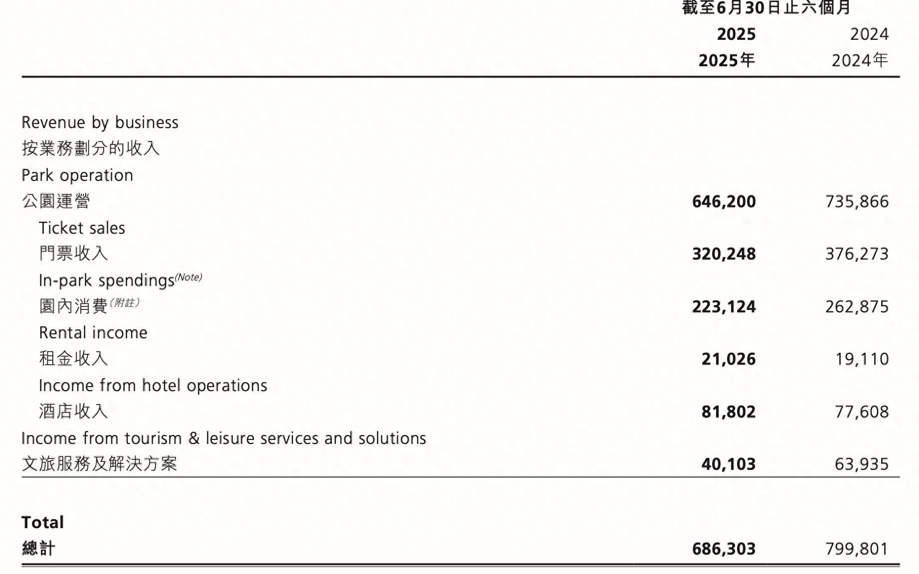 2025年上半年,颓势未止,收入约6.86亿元,同比减少14.19%;归母净亏损约2.96亿元,同比增亏约250%。核心业务板块普遍下滑,公园运营收入下降12.2%,其中门票与园内消费分别减少14.9%和15.1%;被视为增长引擎的文旅服务及解决方案收入更锐减37.3%。仅租金与酒店业务收入微弱增长。