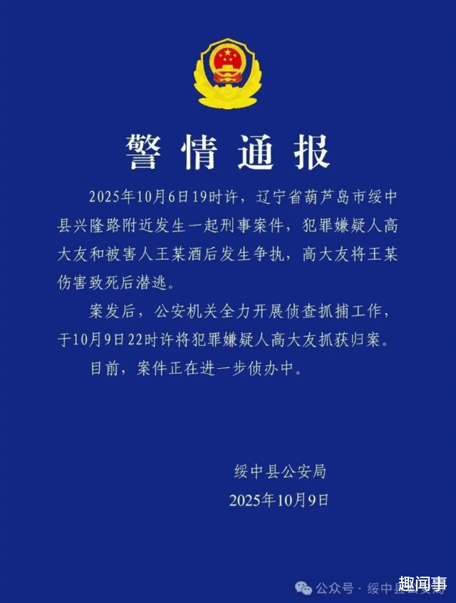 2025年10月6日晚上七点,辽宁绥中县兴隆路旁的一间民房里,酒杯碰撞声突然被嘶吼打断。“我就说了你两句,还敢动手?”44岁的高大友猛地摔碎酒瓶,对面摇摇晃晃的王某指着他的鼻子骂了几句。谁也没想到,这场寻常的酒局会以血案收场——高大友抄起手边的铁器砸向王某头部,邻居后来回忆:“听见像砸西瓜似的闷响,然后就没声了。”