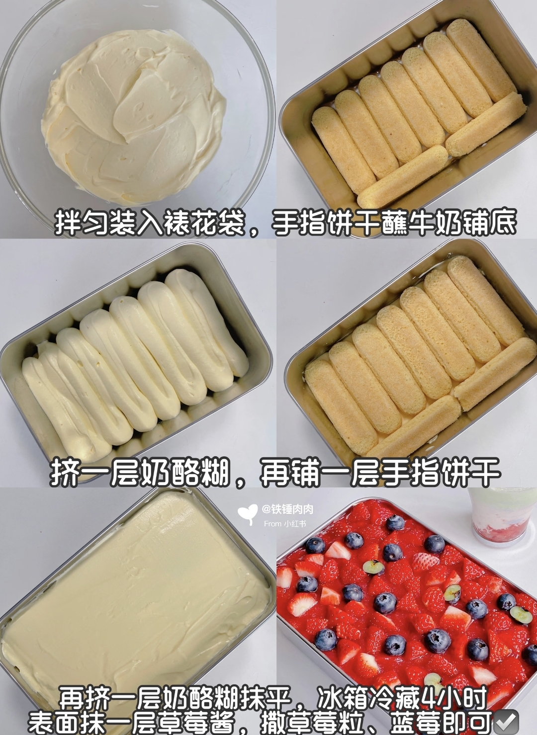 等冷藏好拿出来,用勺子挖一块,能看到清晰的分层,手指饼干的酥脆、奶酪糊的绵密、草莓酱的酸甜在嘴里层层绽放,好吃到让人忍不住眯起眼睛。而且因为没用烤箱,整个过程几乎零难度,就算是厨房小白也能轻松驾驭。