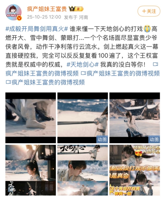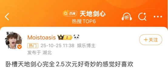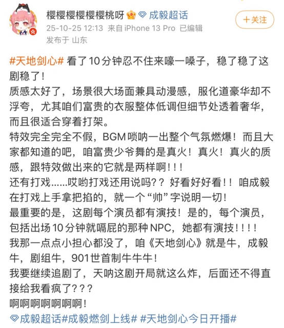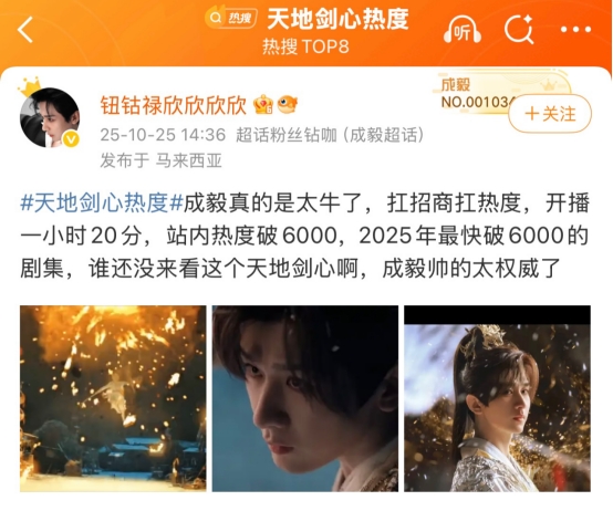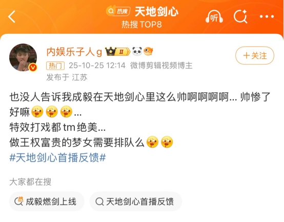 《天地剑心》的开播佳绩,不仅彰显了成毅作为实力派演员的号召力,更让人看到国剧创新的无限可能。相信随着剧情深入,这部突破次元壁的武侠佳作必将带来更多惊喜,期待更多名场面的诞生!