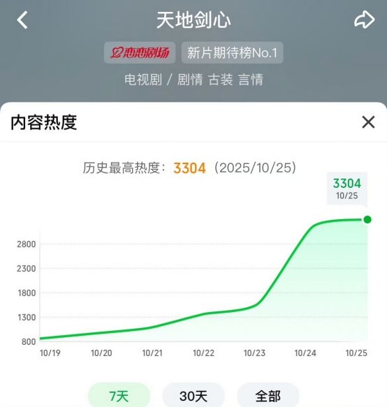 开播首日热度值破8000,刷新爱奇艺平台年度首播热度最高纪录。此前,《天地剑心》未播先火,早已创下惊人纪录:爱奇艺预约量突破550万,平台开播前热度峰值高达3304,刷新历史数据。