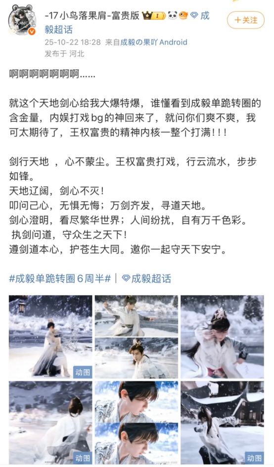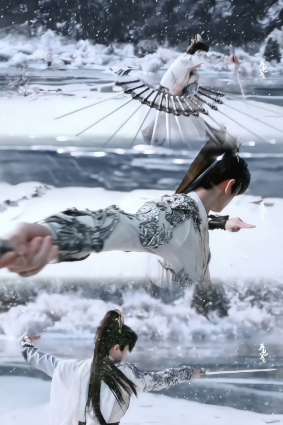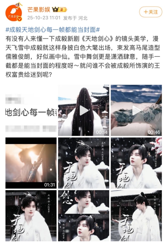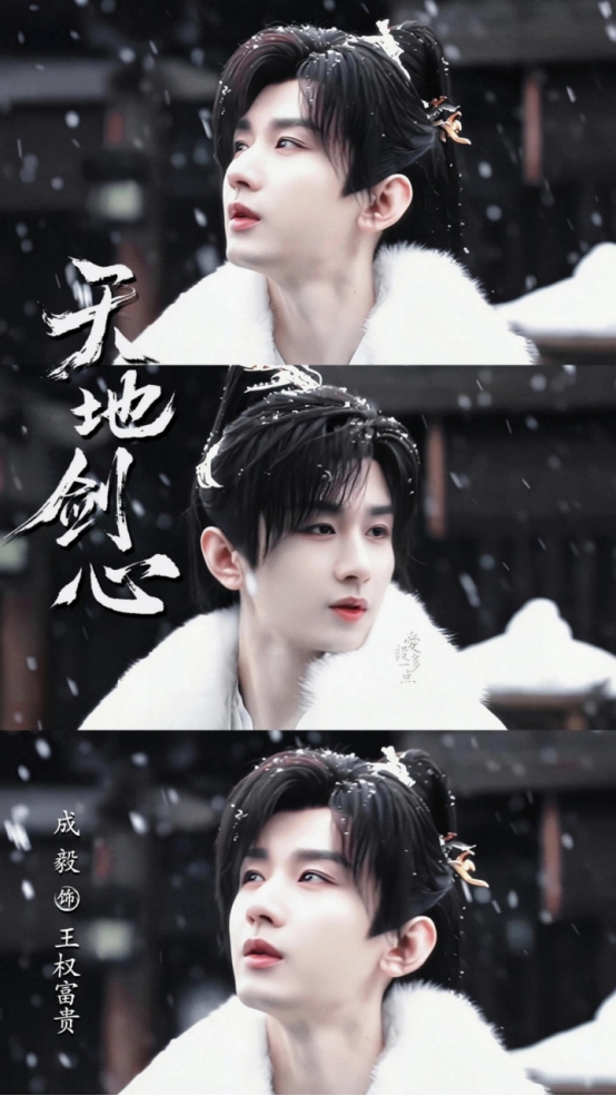 漫天飞雪场景下,成毅身披白色大氅,束高马尾挥剑,动作潇洒肆意,画面被赞“随手一截即封面”,兼具破碎感与肃杀美学。