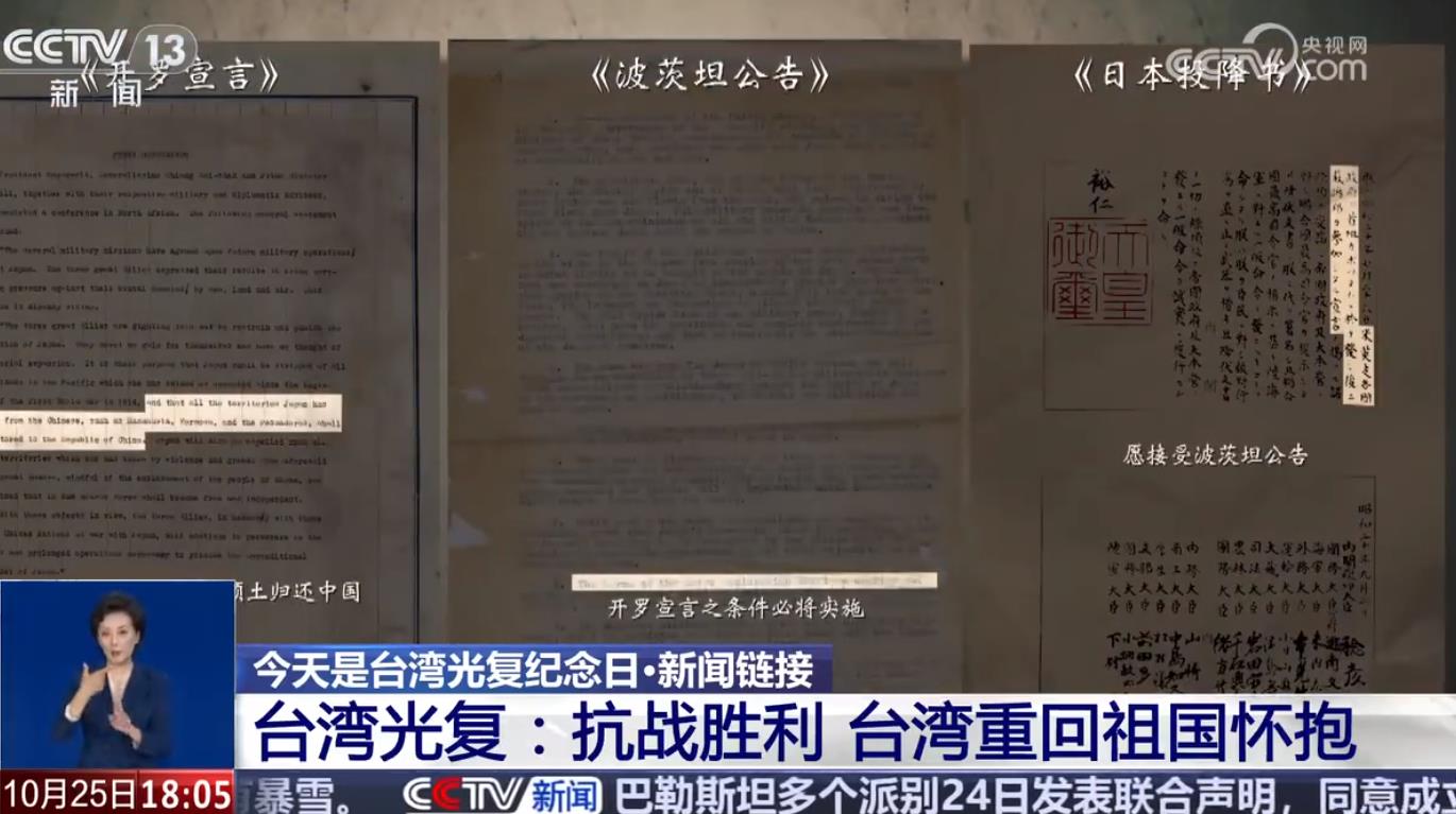 据央视消息,今天是台湾光复纪念日。1945年10月25日,在日本宣布投降2个多月之后,中国战区台湾省受降仪式在台北举行,沦陷五十年的台湾,重回祖国怀抱。一起通过视频回顾台湾光复这一中华民族不可忘却的记忆。