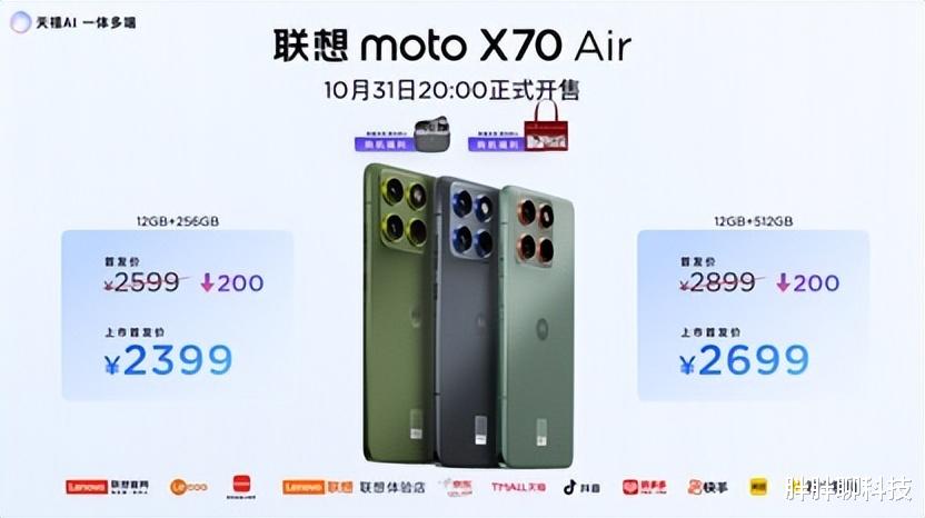 联想moto X70 Air AI手机售价2599元起,10月31日晚8时全渠道正式开售,首销福利限时优惠仅2399元起,还可享国补和平台补贴等多重优惠。