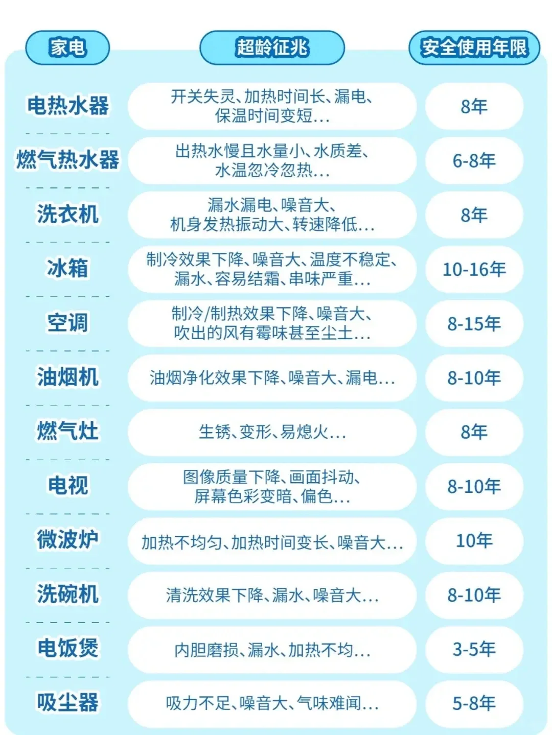 国家有明确的规定:每个家电都有安全使用年限。如,冰箱安全使用年限为10-12年,洗衣机的安全使用年限为8-10年……
