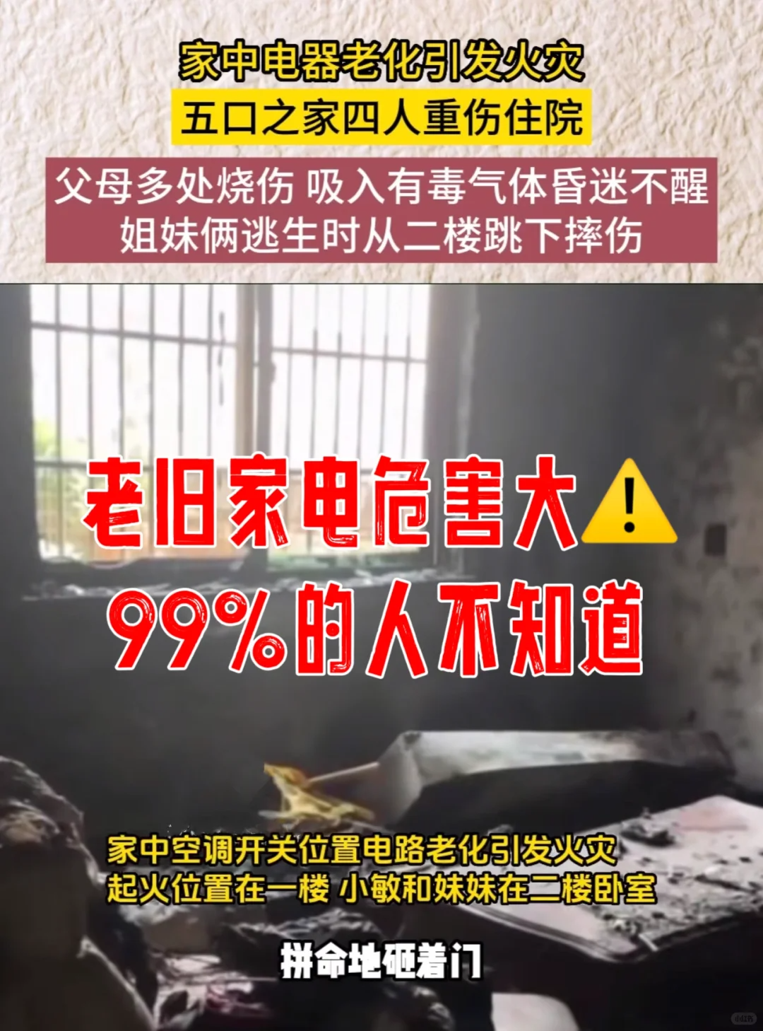 如,网友@蓝妹妹炸毛版:真实案例,家中电器老化引起火灾,直接导致五口之家四人重伤,家里全部被烧毁。