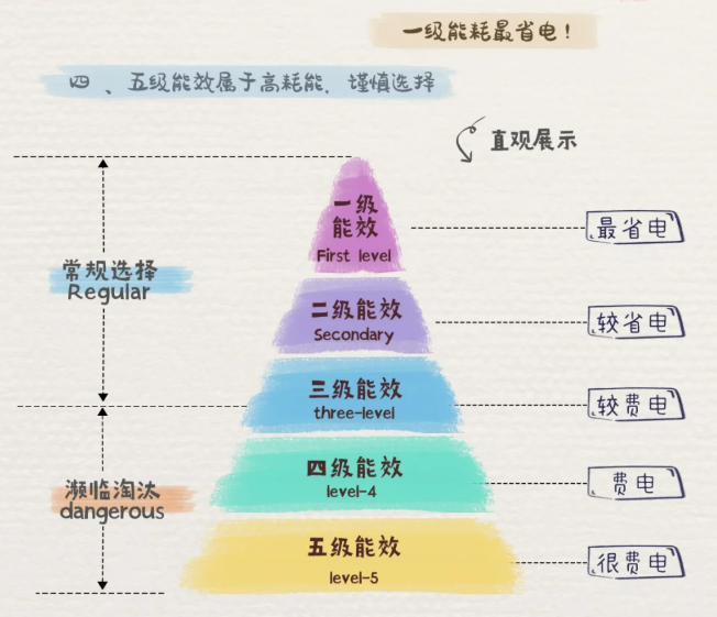因为新国标家电的能耗分为一到五级。一级最节能环保;二级相当老国标的一级,相对节能;三级或以上为高能耗产品。