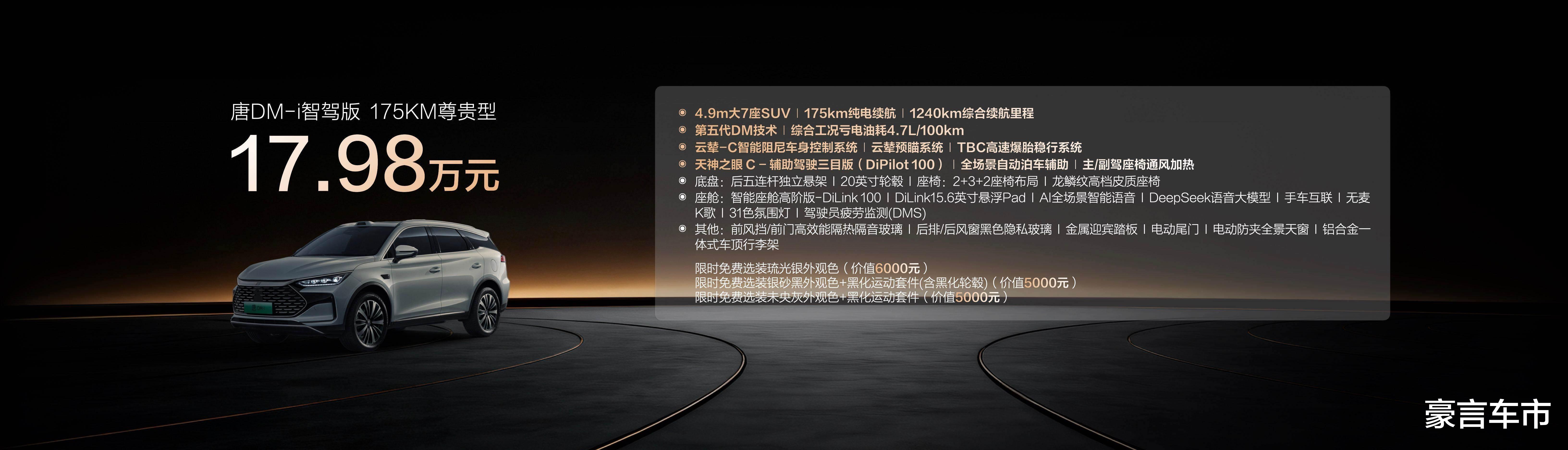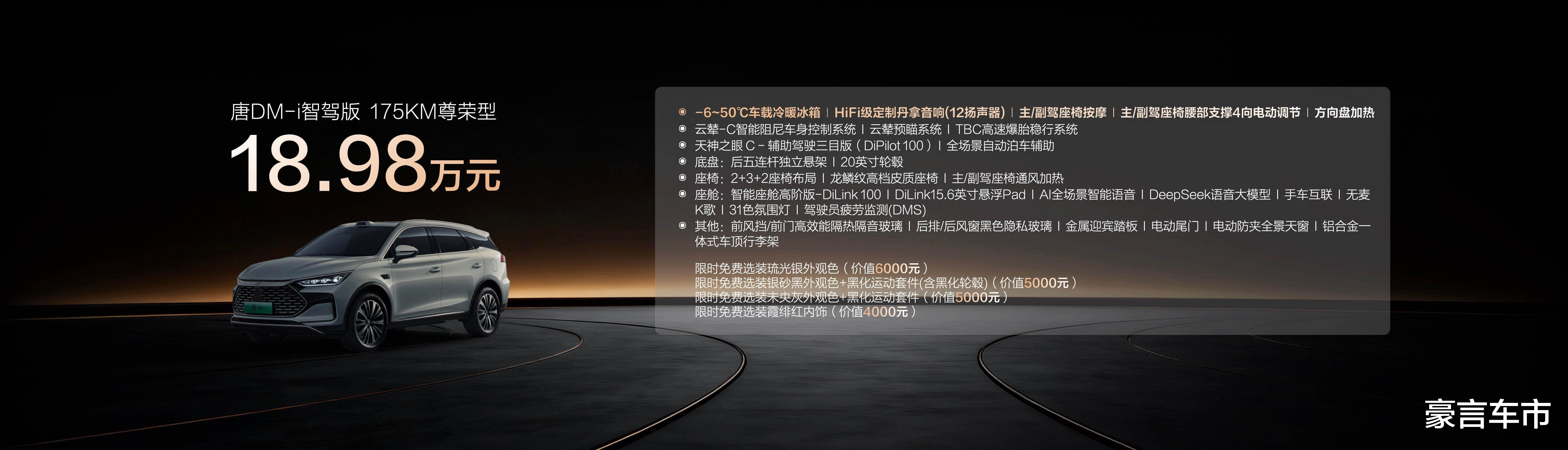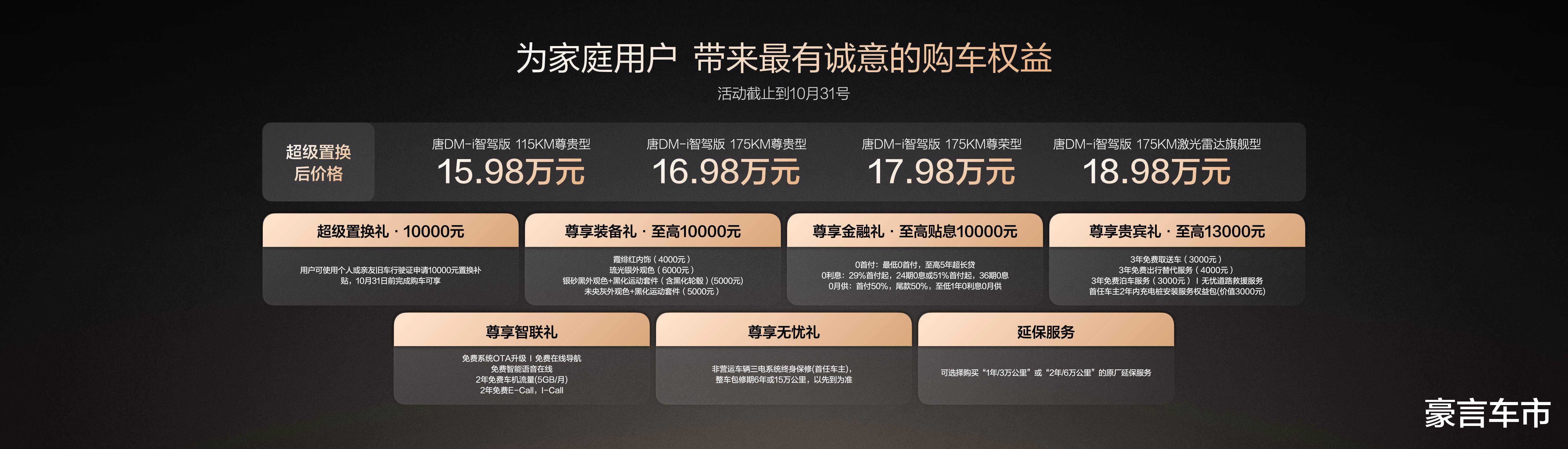 对于一直热销的唐DM-i智驾版115KM尊贵型,目前官方指导价为17.98万元。比亚迪王朝网特别推出金秋限时礼遇,限时优惠价格低至16.98万元!惊喜不止于此,为答谢80万车主朋友,王朝网又特别争取到了一份限时权益:10月31日前完成购车的朋友们,可享受1万元的超级置换补贴!这意味着,唐DM-i智驾版的四款车型,超级置换补贴后价格仅为15.98万元起!