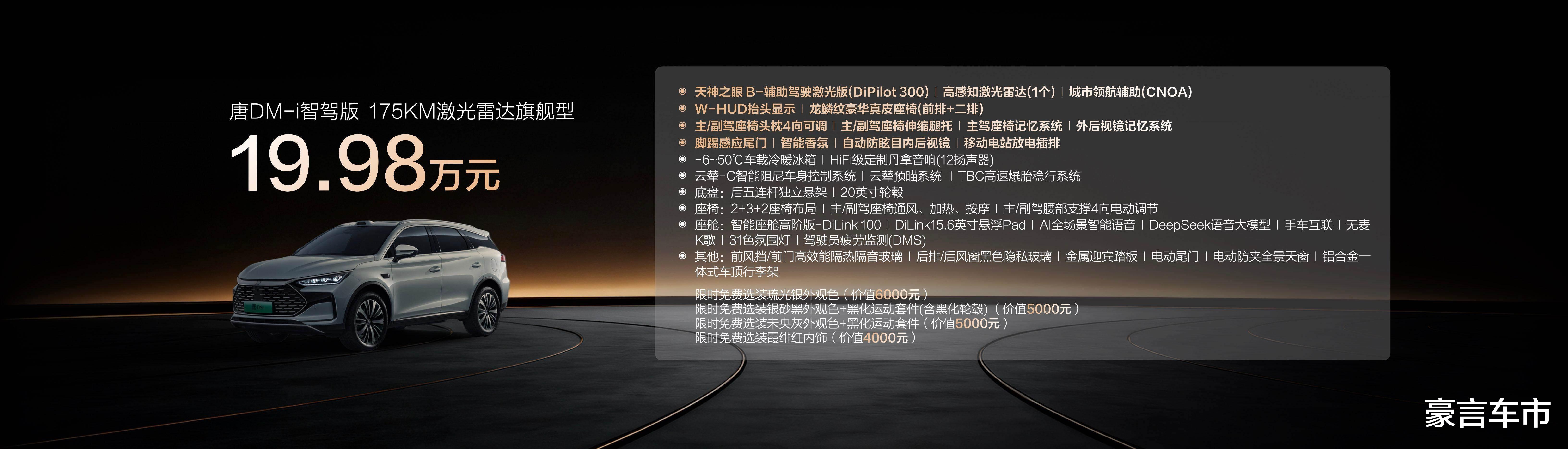 • 核心配置:搭载天神之眼B辅助驾驶激光版,配备W-HUD抬头显示、前排腿托、智能香氛等。
