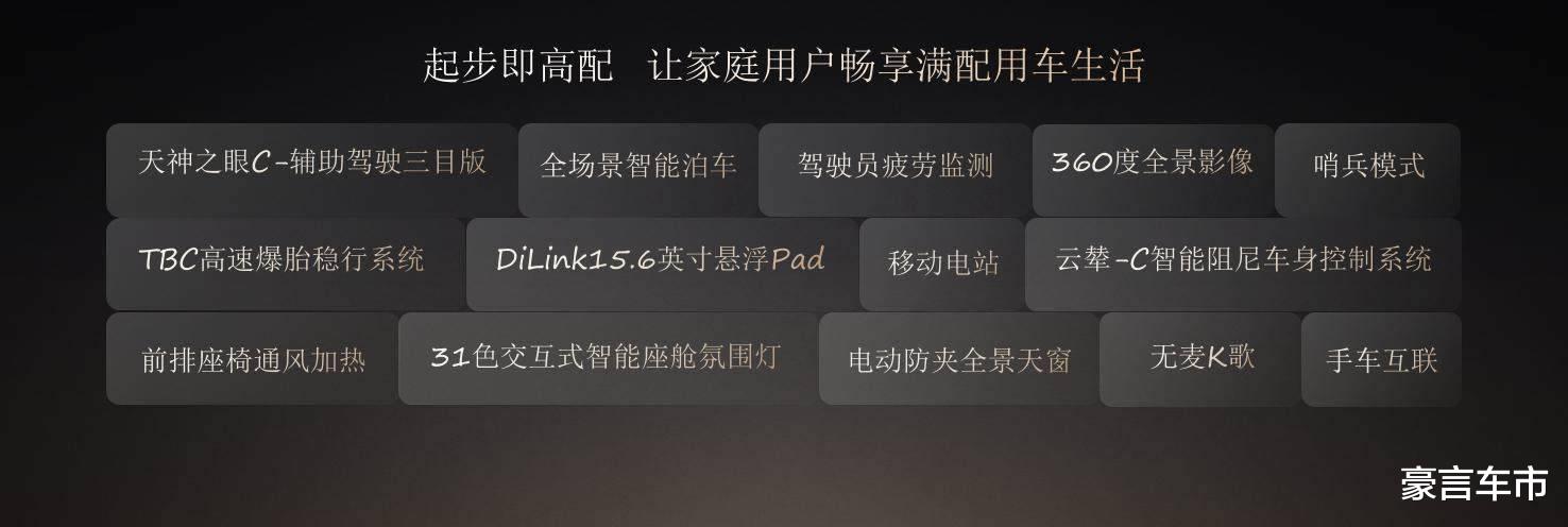 • 核心配置:大七座空间,前排座椅通风加热,隔音隔热隐私玻璃,天神之眼C辅助驾驶三目版,云辇-C和TBC标配。