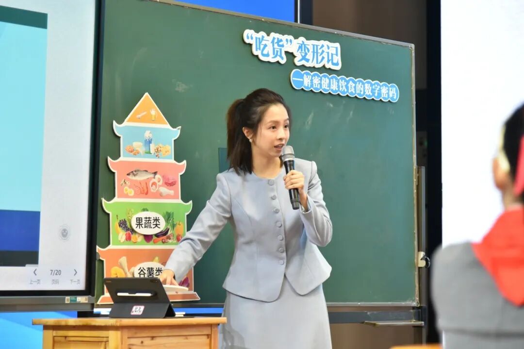 来自重庆市人民小学的周桦老师带着孩子们进行了《“吃货”变形记——解密健康饮食的数字密码》。孩子们依据膳食宝塔和国家营养标准,设计出种类均衡、分量适宜的午餐搭配方案;运用人民小学自创智能体AI工具“健康饮食小助手”辅助解决午餐搭配中的分量规划问题;最后利用“十个网球”重量、体积守恒原则将每道菜的克重具象化。引导学生在活动中深度思考,将健康饮食知识转化为实际生活中的行动。