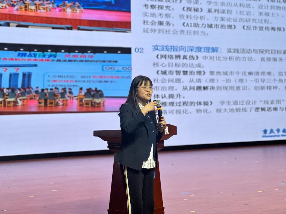 南岸区教师进修学院课改部毛擘主任对此次赛课活动进行了点评和总结。毛老师首先对15节精彩的综合实践课给予认可和肯定,强调本次赛课,研究性学习优势显著,以真问题驱动课堂,并能结合生活与社会实际,将课程形成完整探究链条,激发学生的课堂主动性。课堂实践形态多元且紧扣素养目标,跨学科深度融合,AI 进入课堂,辅助学生思维与实践,助力创新思维发展同时,毛老师也表明了未来期望,指出了努力方向,期待未来能构建“探究 ——实践 ——创新”的新范式,重塑师生角色,推动综合实践教学常态化。