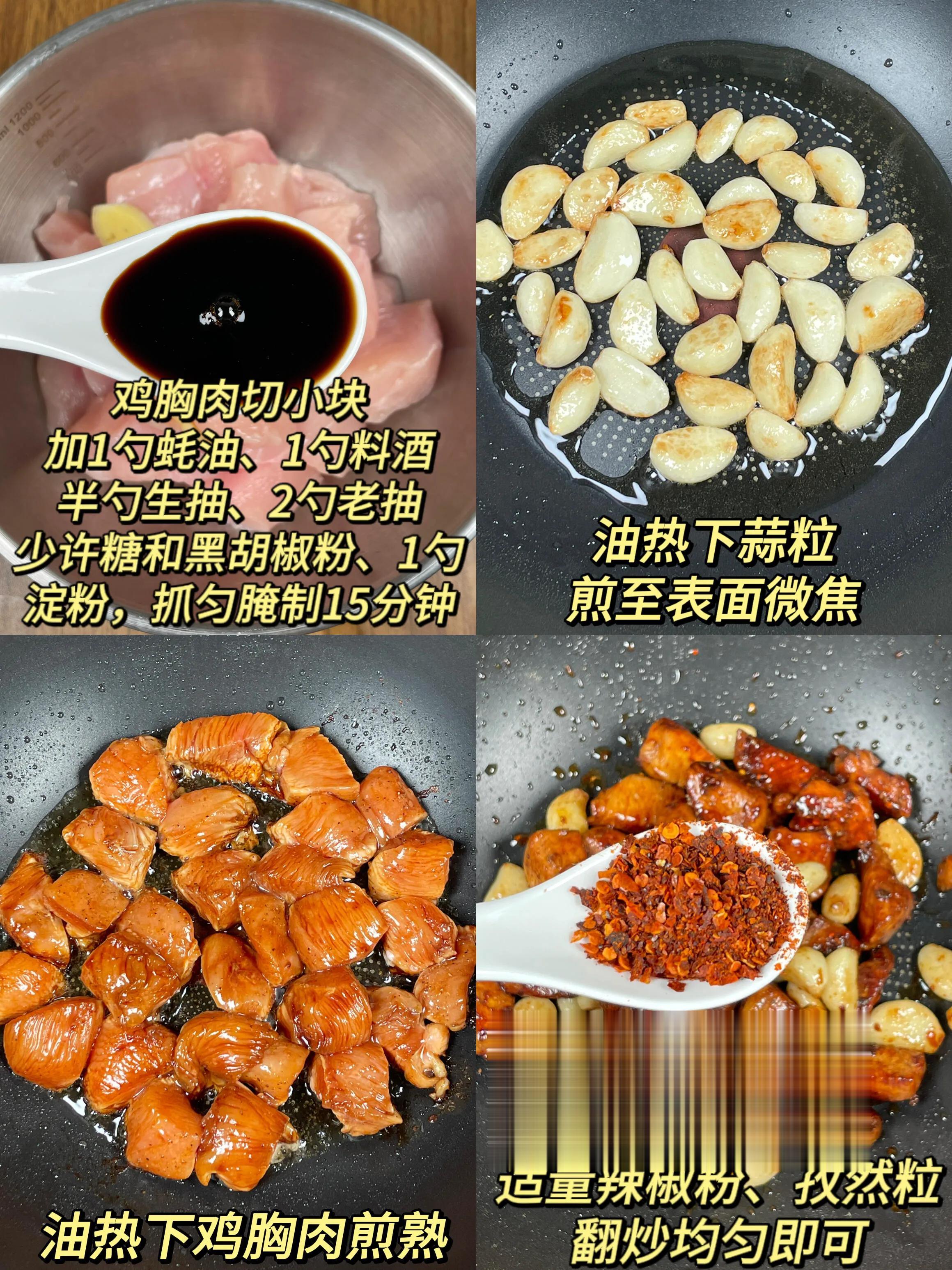 蒜香味的灵魂在于蒜蓉的处理。别用刀剁!用压蒜器挤出蒜泥最香,或者用刀背拍碎再切末。关键技巧来了:蒜蓉先用热油小火煸炒出金黄香气,晾凉后和鸡胸肉一起腌制。这样处理过的蒜香更醇厚,还不会有生蒜的辛辣感。腌料里加半勺蜂蜜代替糖,能让肉质更嫩滑,煎的时候还能形成漂亮的焦糖层。