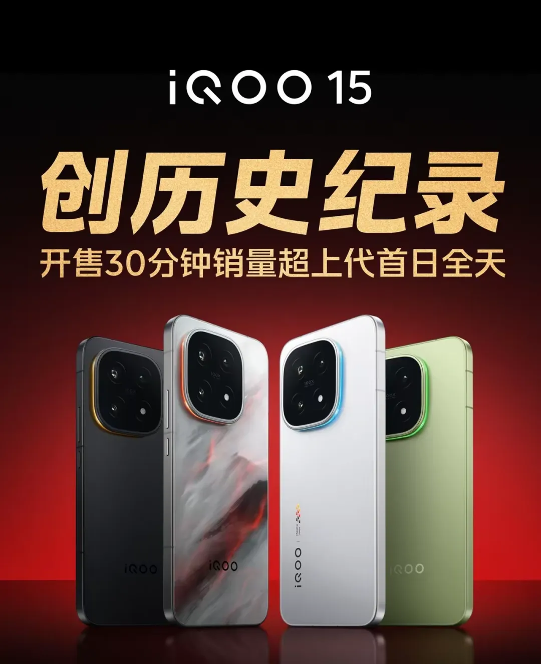 iQOO15发布后就上市开卖了,不久后官方就宣布:iQOO 15 上市创 iQOO 历史销量纪录,开售30分钟销量超上代首日全天销量。前两代产品,iQOO12和iQOO13起步价都是3999元,这一代iQOO15很早就曝光配置,从各方面配置来看,升级还是很大的,尤其是屏幕用料很好,成本很高,所以涨价是必然的。