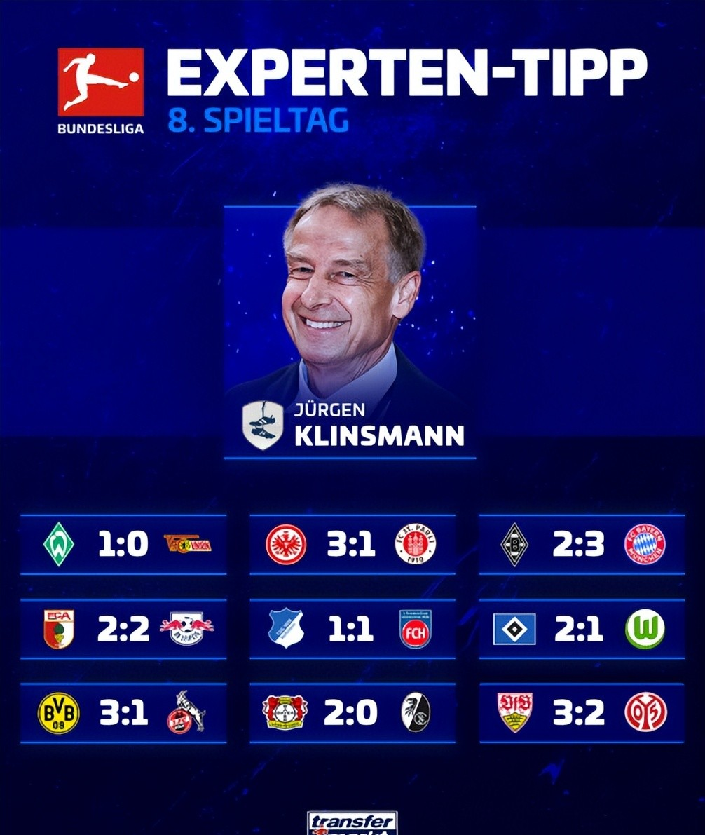 克林斯曼预测德甲:门兴23拜仁,汉堡21狼堡,多特31科隆,霍村11