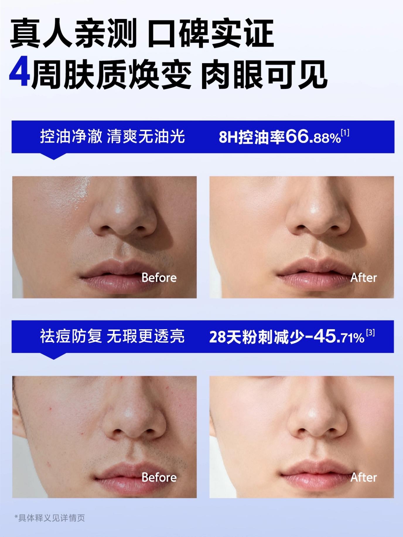 控油维稳:T 区出油量减少 80%,24 小时维持皮肤清爽,4 周毛孔堵塞率降低 65%,从根源减少痘痘生成;