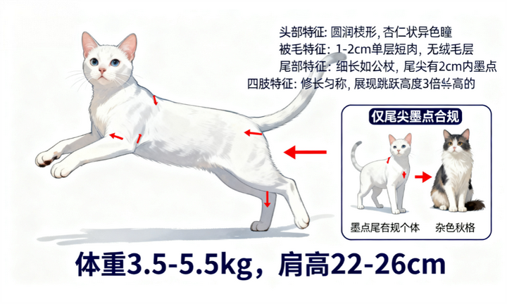 毛色标准:纯种泰国御猫以 “通体雪白” 为首要标准,仅允许尾尖出现直径不超过 1 厘米的黑色斑点(俗称 “墨点尾”),其他部位若有杂色则被视为失格。被毛紧贴体表,无蓬松感,阳光照射下会呈现细腻的珍珠光泽。