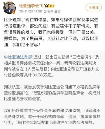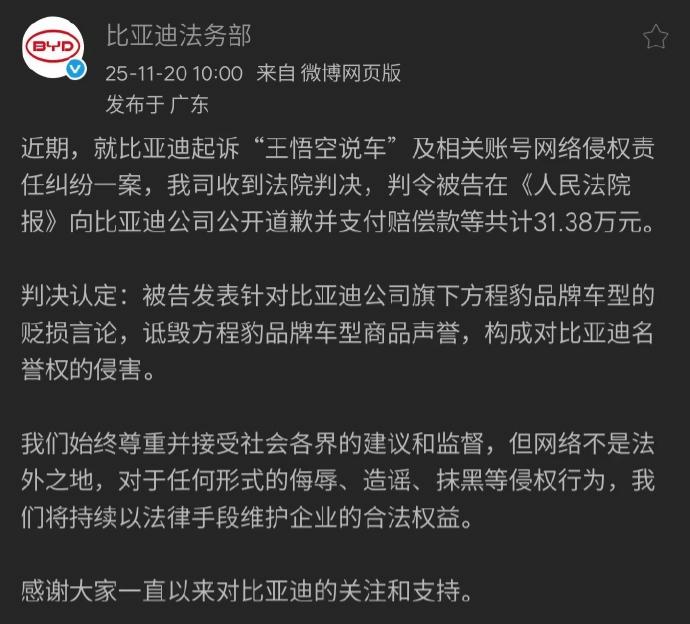 赔偿31.38万,公开道歉,王悟空说车咎由自取,比亚迪等来正义判决。