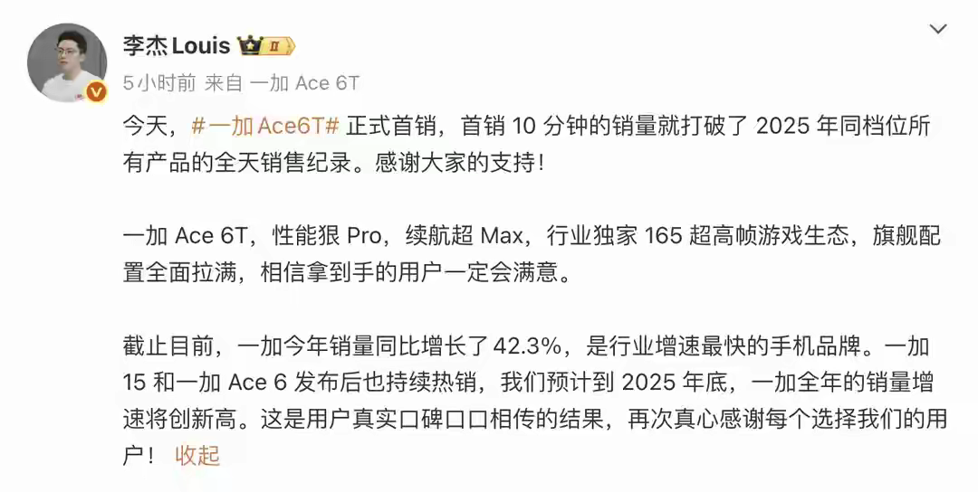 一加Ace6T是本月3号发布的,发布价2599元,首销价2399元,叠加地方补贴后,低至2159元左右,该机在本月5号正式开卖,首销开卖10分钟,就打破了2025年同档位所有产品的全天销售纪录,这款手机定价在两千档价位上,竞争对手主要是红米K90,iQOONeo11,真我GT8等产品,对于自家的Ace6也是有一定的影响,不少用户目前也是在纠结买Ace6还是Ace6T吧。