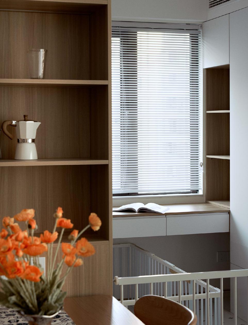 全开放式的书房,其实是一个多功能房间。可以日常办公写字,也可以作为宠物栖息区使用。同时,整面墙的储物柜,还提供了强大的收纳力。