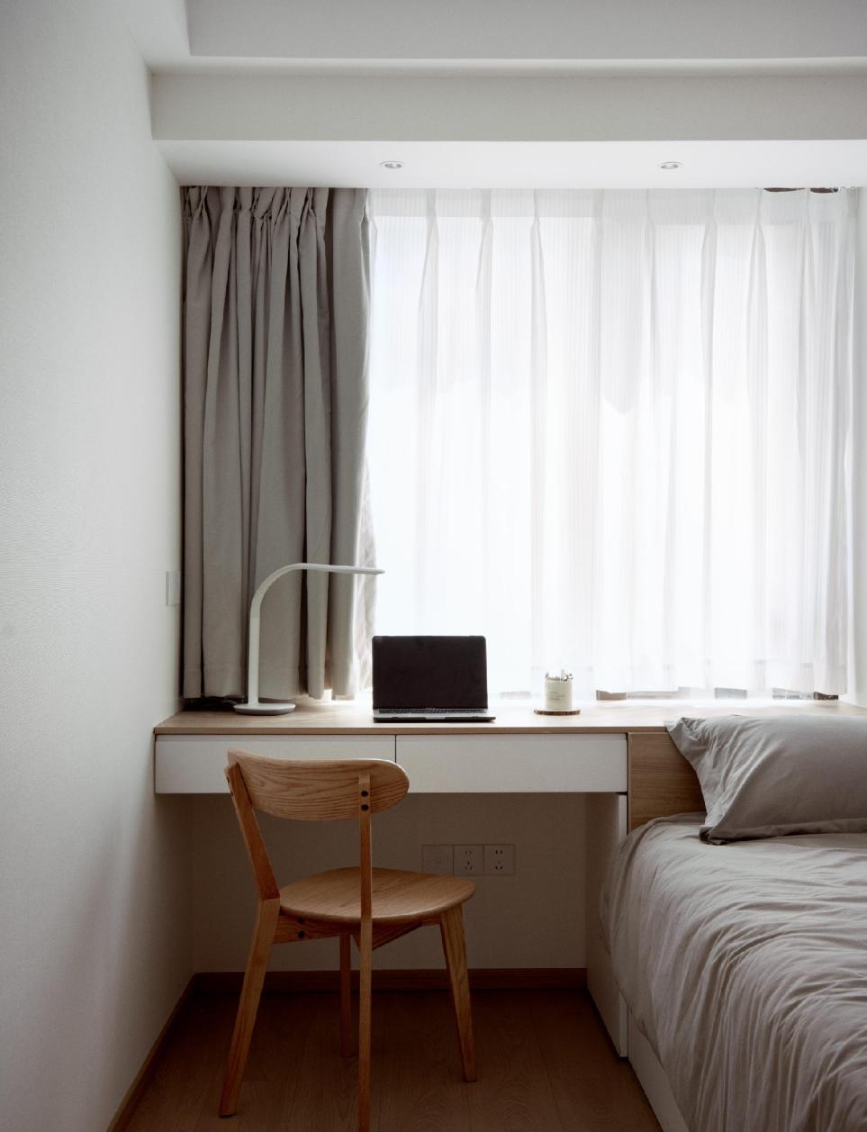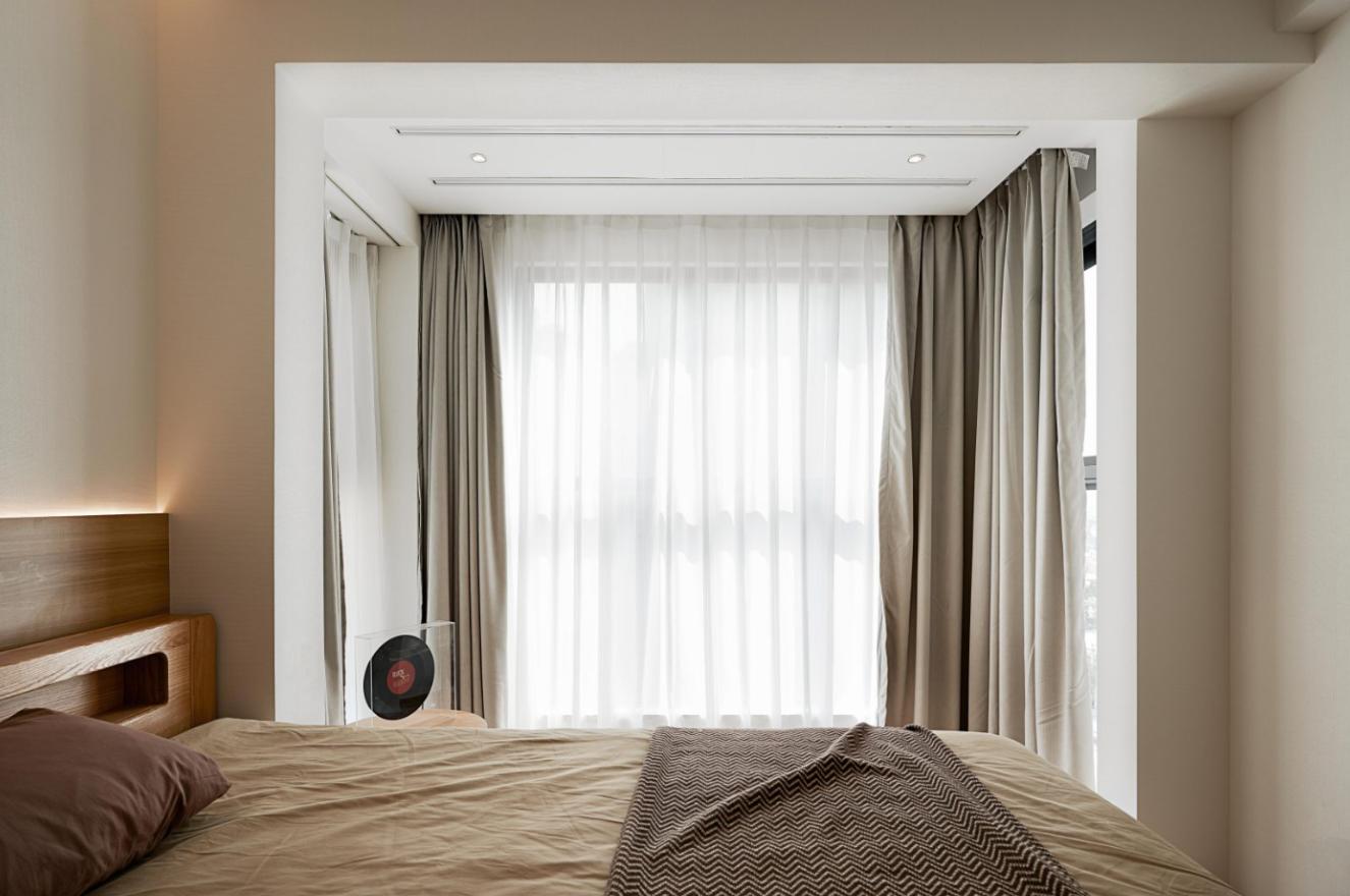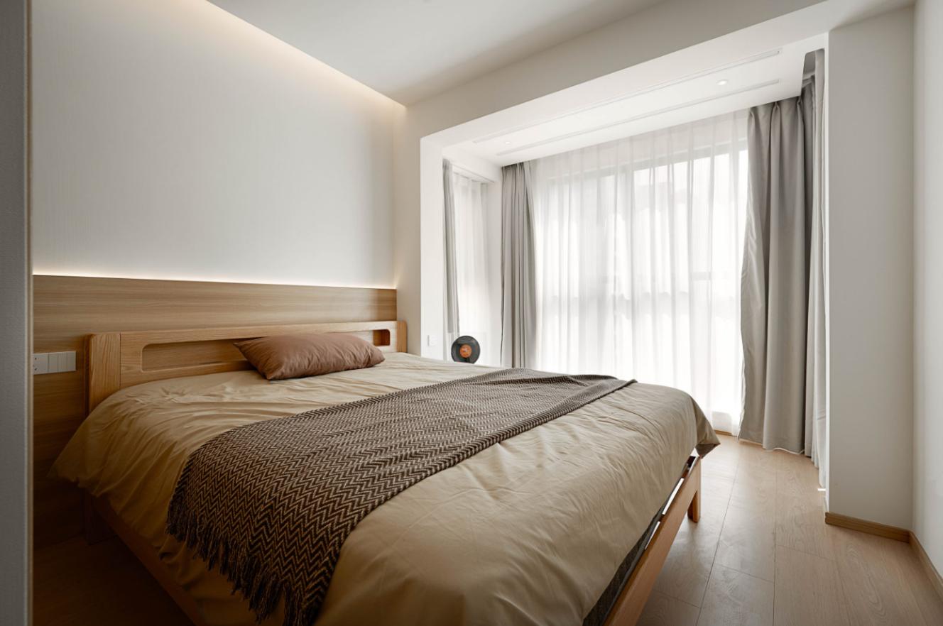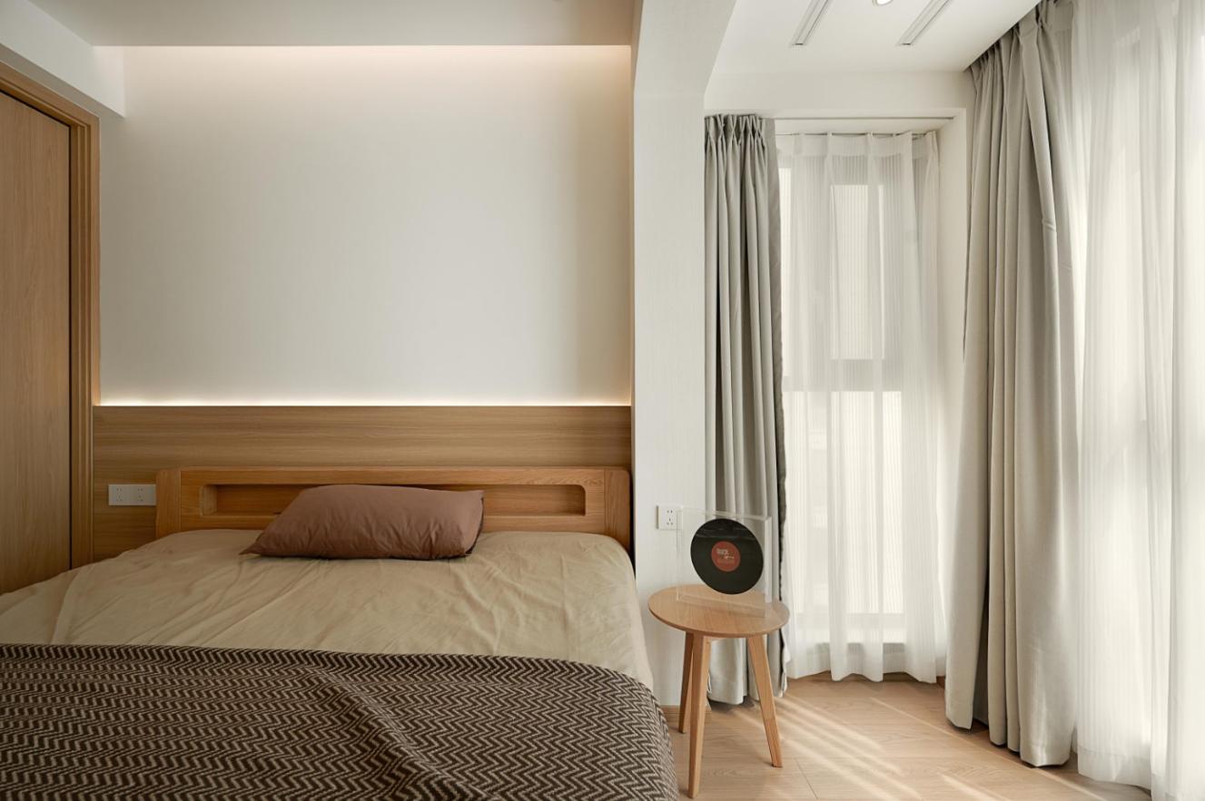 床头增加极简木饰面护墙设计,既有效拉伸了空间层次,大量的留白,也似乎容纳了悄然生长的情绪。