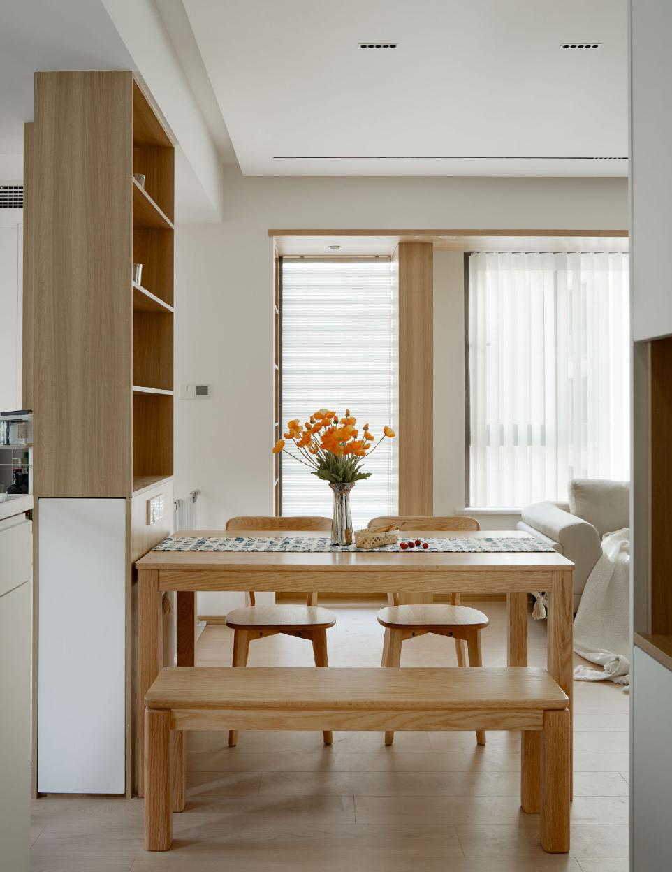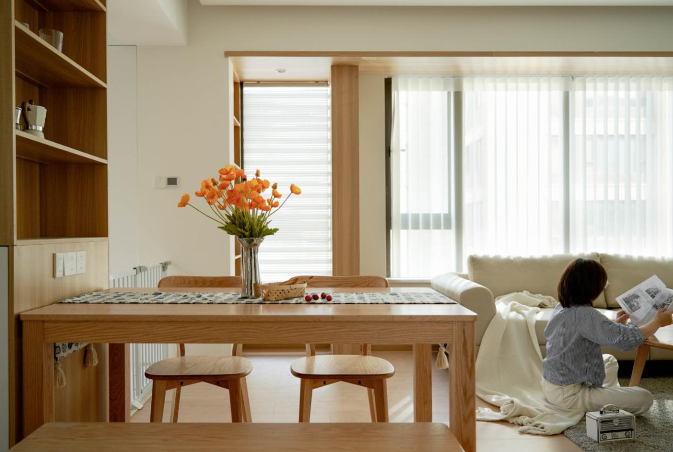 餐桌作为进门后的第一视角焦点,并没有进行过多的装饰处理。仅通过原木家具本身温润的质感,表达了空间的自然和谐。毕竟最自然的装饰,才最贴近生活。