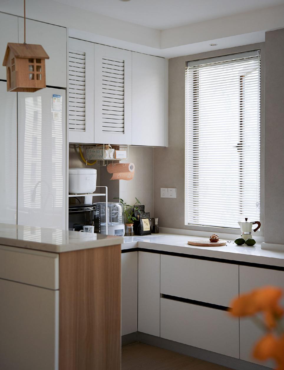 阳台纳入室内之后,除了可以拓展空间感之外,也能更好的引光入室,让空间更加轻快、明亮。同时,顶面隐形晾衣架设计,也丝毫不会破坏整体感。