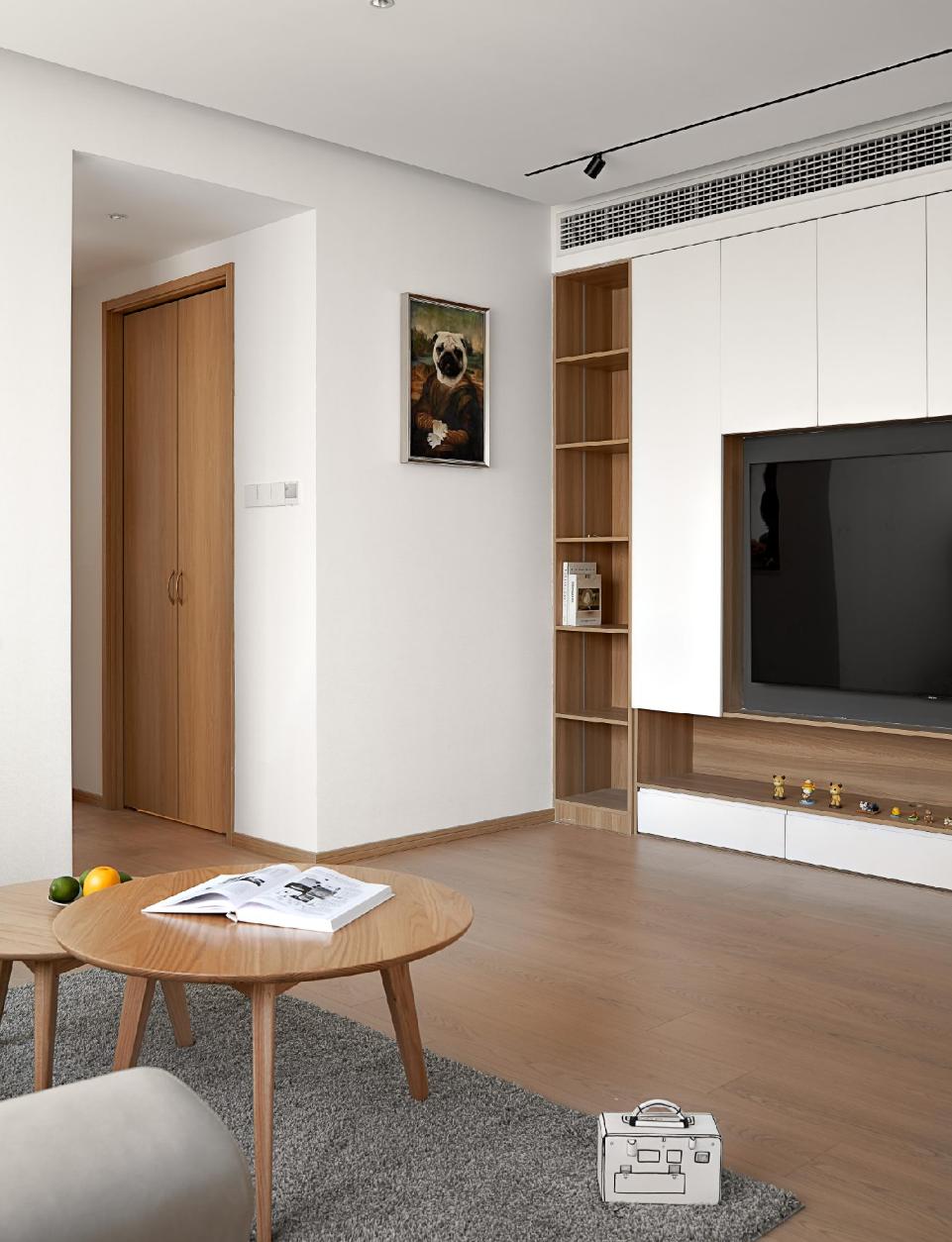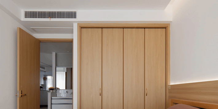 电视墙左侧,就是重新规划出的独立衣帽间,储物能力十分强大,并且为了增加进出动线舒适性,还做了双扇折叠门隔断。