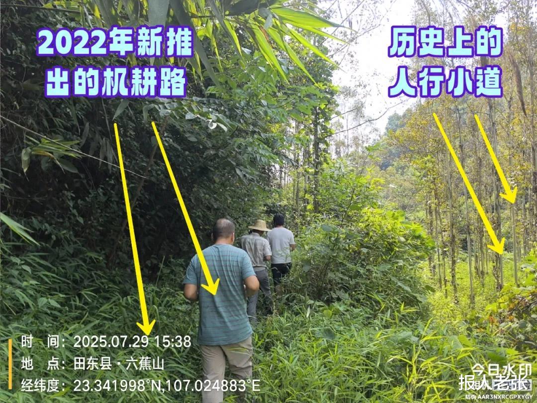 周吉隆称,案涉被清理、推成简易道路的林地,原来就是坡地,根本就不是屯里自2007年就修建的什么机耕道,实际上是2021年底,外地老板承包附近山林的树木要砍伐,想要修一条路运木材,才编造了案涉林地是机耕路的说法。