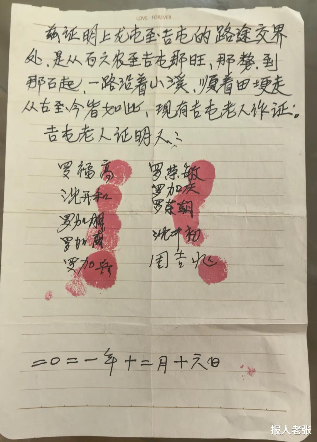 周吉隆的说法,得到了那沙通往邻村吉屯多名村民的证实。至少有10名吉屯村民为周吉隆的说法出具证明,称从那沙至于吉屯的道路,自古至今,都是沿着小溪,顺着田埂走。而案涉林地,与田埂、小道之间还隔着一条小溪。