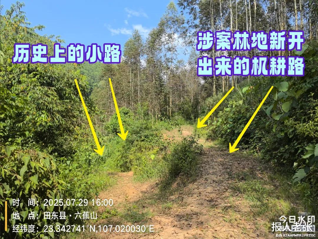 2022年4月28日,田东县林业局派出执法人员前往调查发现,毁林现场由上龙屯村民小组长蒙某宁为代表,组织机械、人员在案涉林地用挖掘机碾压钩毁、毁坏林木,且未办理《林木采伐许可证》,涉嫌毁坏林木。