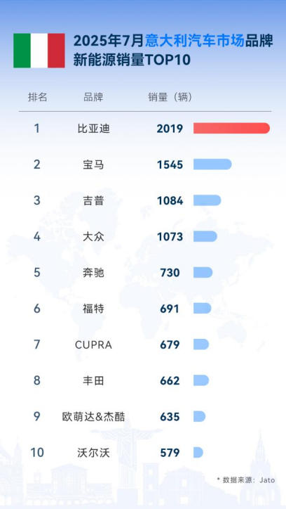 7月,比亚迪以2019辆的销量成绩,稳居意大利新能源乘用车销量榜首,占据13%以上的市场份额。其中,插电式混合动力车销量达1408辆,占该细分市场的16%;纯电动车销量达559辆,占该细分市场的10%。这一成绩不仅印证了其欧洲扩张策略的成效,更标志着意大利汽车行业格局的深刻变革——这个传统汽车市场,正以开放姿态加速拥抱电动化转型。
