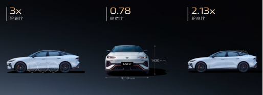 用户对汽车的产品需求正由“出行工具”转向“自我表达载体”,这意味着好的产品外观不仅要符合他们的审美,更要与他们的人生态度共鸣。对此,第三代UNI-V采用专为年轻灵魂定制的“未来先锋运动美学”设计语言,1:3.3的极致头身比,使整车侧面看上去更加修长舒展;3倍轮轴比设计,让车轮与轴距在视觉上达成了一种精妙平衡;而0.78倍的黄金高宽比配合2.18倍的轮高比,让车身呈现出高性能轿跑该有的低趴运动姿态,宽体车身也进一步提升了乘坐舒适性。