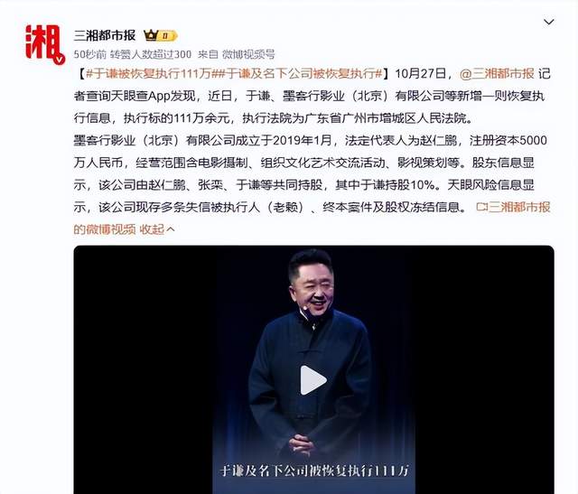 相声界“捧哏皇后”于谦正面临一场商业信誉危机,他持股的影视公司被恢复执行111万元,而这家公司总被执行金额已惊人地超过7550万元。