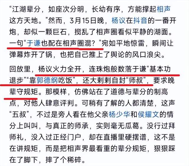 更早前,杨议在直播间的发言也被网友重新翻出。当时杨议一句“他于谦也配在相声圈混?”宛如平地惊雷,不仅将于谦送上热搜,也把自己推向舆论的风口浪尖。