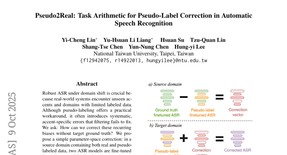 来自国立台湾大学的研究团队在2025年10月发表了一篇名为《Pseudo2Real: Task Arithmetic for Pseudo-Label Correction in Automatic Speech Recognition》的重要研究论文,该论文发表在arXiv平台上,编号为arXiv:2510.08047v1。这项由林毅诚、李宇轩良、苏轩、林慈权、陈尚澤、陈蘊儂和李宏毅等学者共同完成的研究,为语音识别技术在不同口音和方言环境下的应用提供了一个创新性的解决方案。