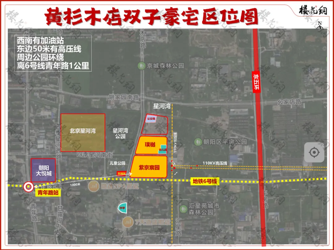 它们的弱点也很显性:紫京宸园南面是主干道朝阳北路、东面是高压线塔;璞樾东南角是幼儿园。